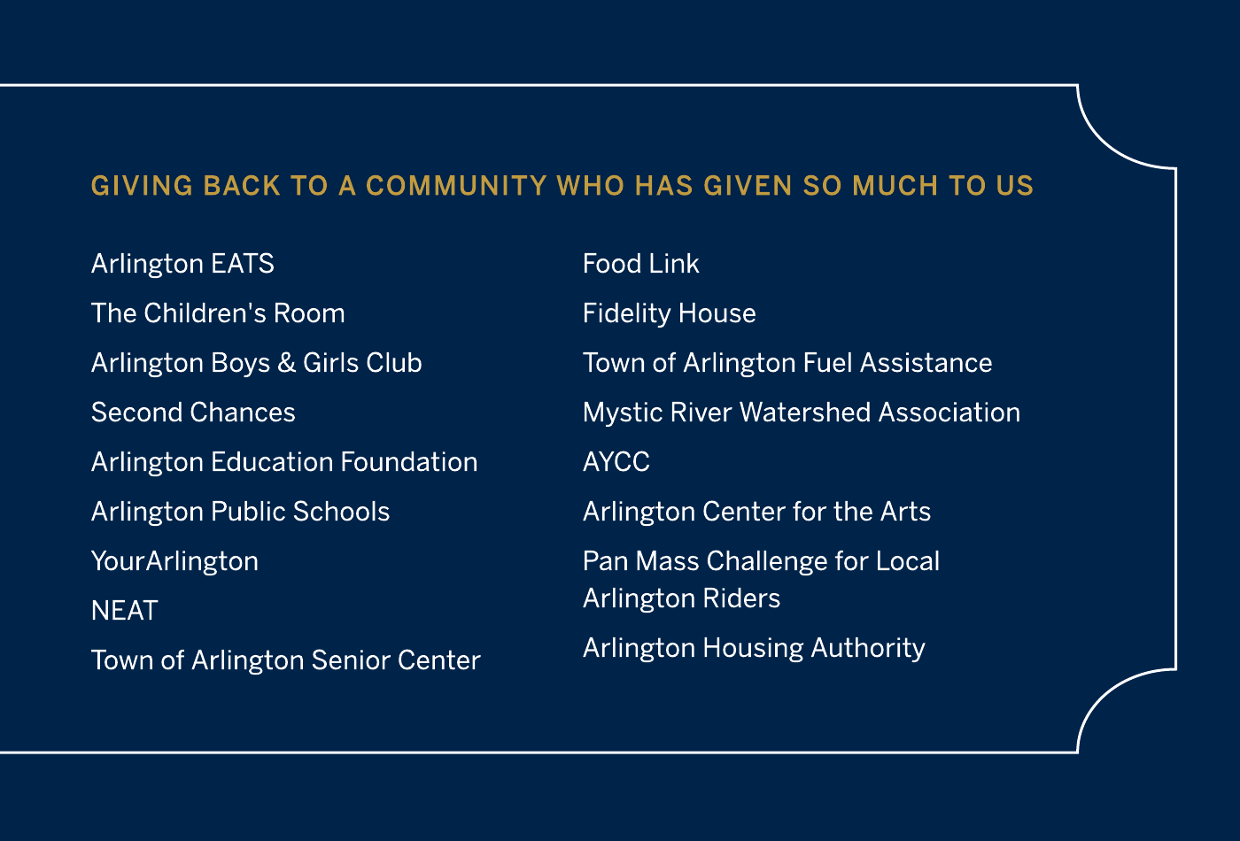 Supporting our clients and giving back to our community go hand-in-hand. We’re deeply invested in Arlington, and we believe in building strong connections with the organizations that work tirelessly to make our town vibrant, supportive, and inclusive.